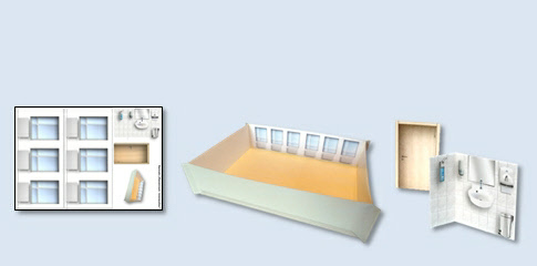 - 1 Fliesenecke mit Waschbecken und Hygienematerial